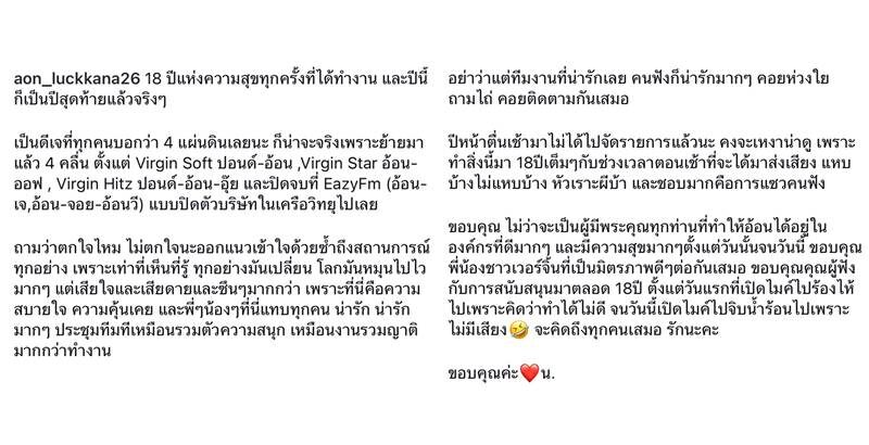 ขอบคุณ ไม่ว่าจะเป็นผู้มีพระคุณทุกท่านที่ทำให้อ้อนได้อยู่ในองค์กรที่ดีมากๆ และมีความสุขมากๆ ตั้งแต่วันนั้นจนวันนี้ ขอบคุณพี่น้องชาวเวอร์จิ้นที่เป็นมิตรภาพดีๆ ต่อกันเสมอ ขอบคุณคุณผู้ฟังกับการสนับสนุนมาตลอด 18 ปี ตั้งแต่วันแรกที่เปิดไมค์ไปร้องไห้ไปเพราะคิดว่าทำได้ไม่ดี จนวันนี้เปิดไมค์ไปจิบน้ำร้อนไปเพราะไม่มีเสียง จะคิดถึงทุกคนเสมอ รักนะคะ ขอบคุณค่ะ❤️น.”