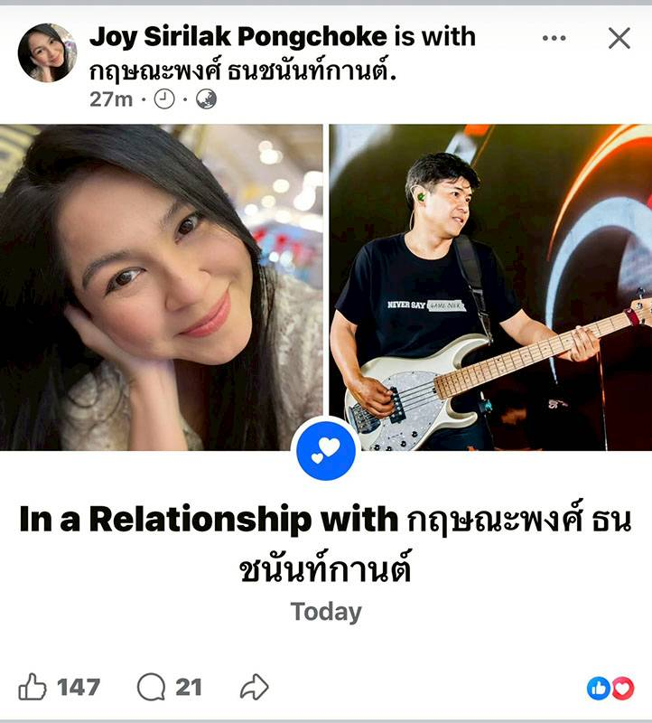 ทำเอาฮือฮาอยู่ไม่น้อย หลังจากเฟซบุ๊ก Joy Sirilak Pongchoke ของอดีตนางเอกชื่อดัง “จอย ศิริลักษณ์ ผ่องโชค” ที่มีผู้ติดตาม 8.2 พัน ได้โพสต์ข้อความเปิดตัวกำลังคบกับ “บี กฤษณะพงศ์ ธนชนันท์กานต์” นักดนตรีมือเบส โดยฝ่ายชายก็ได้โพสต์เปิดตัวเช่นเดียวกัน