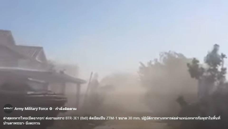 เพจ Army Military Force รายงานความคืบหน้าสถานการณ์ความมั่นคงตามแนวชายแดนไทย–กัมพูชา โดยระบุว่า กองทัพบกไทย ได้เปิดฉากปฏิบัติการเชิงรุก ส่งยานเกราะล้อยาง BTR-3E1 (8×8) ติดตั้งป้อมปืน ZTM-1 ขนาด 30 มิลลิเมตร เข้าดำเนินการทางทหารต่อที่ตั้งกำลังฝ่าย กัมพูชา